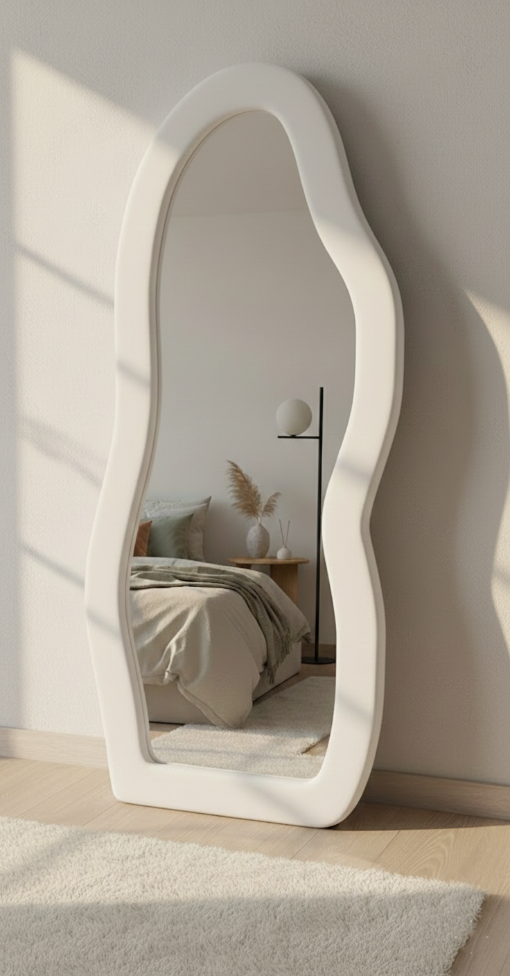 This mirror is made with a strong wooden frame for long-lasting use. It is upholstered in soft beige velvet fabric that gives a clean and elegant look. The modern wavy design adds style and beauty to any space. The high-quality mirror provides a clear and sharp reflection. Its full-length size makes it perfect for daily use and home décor. Ideal for bedrooms, dressing areas, and living rooms. A perfect mix of style and functionality.